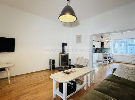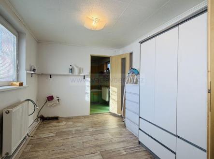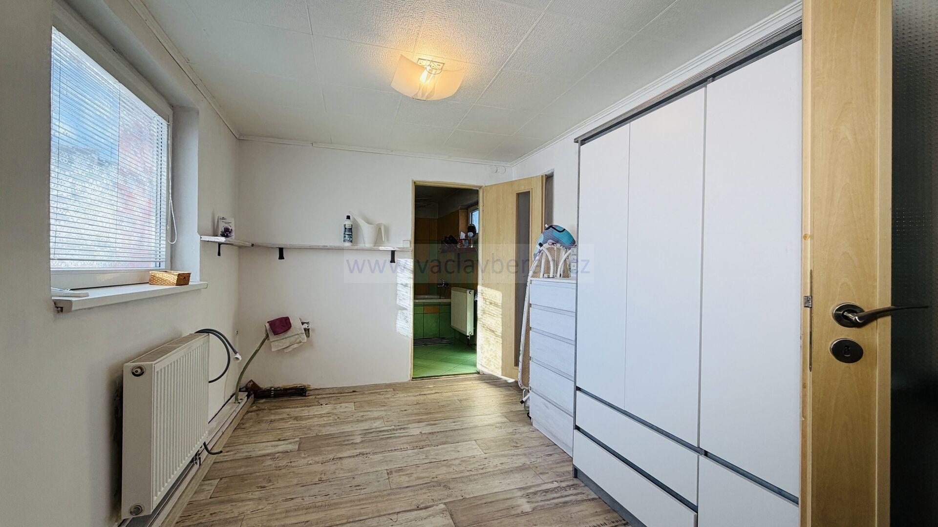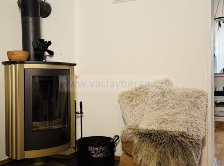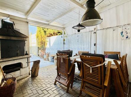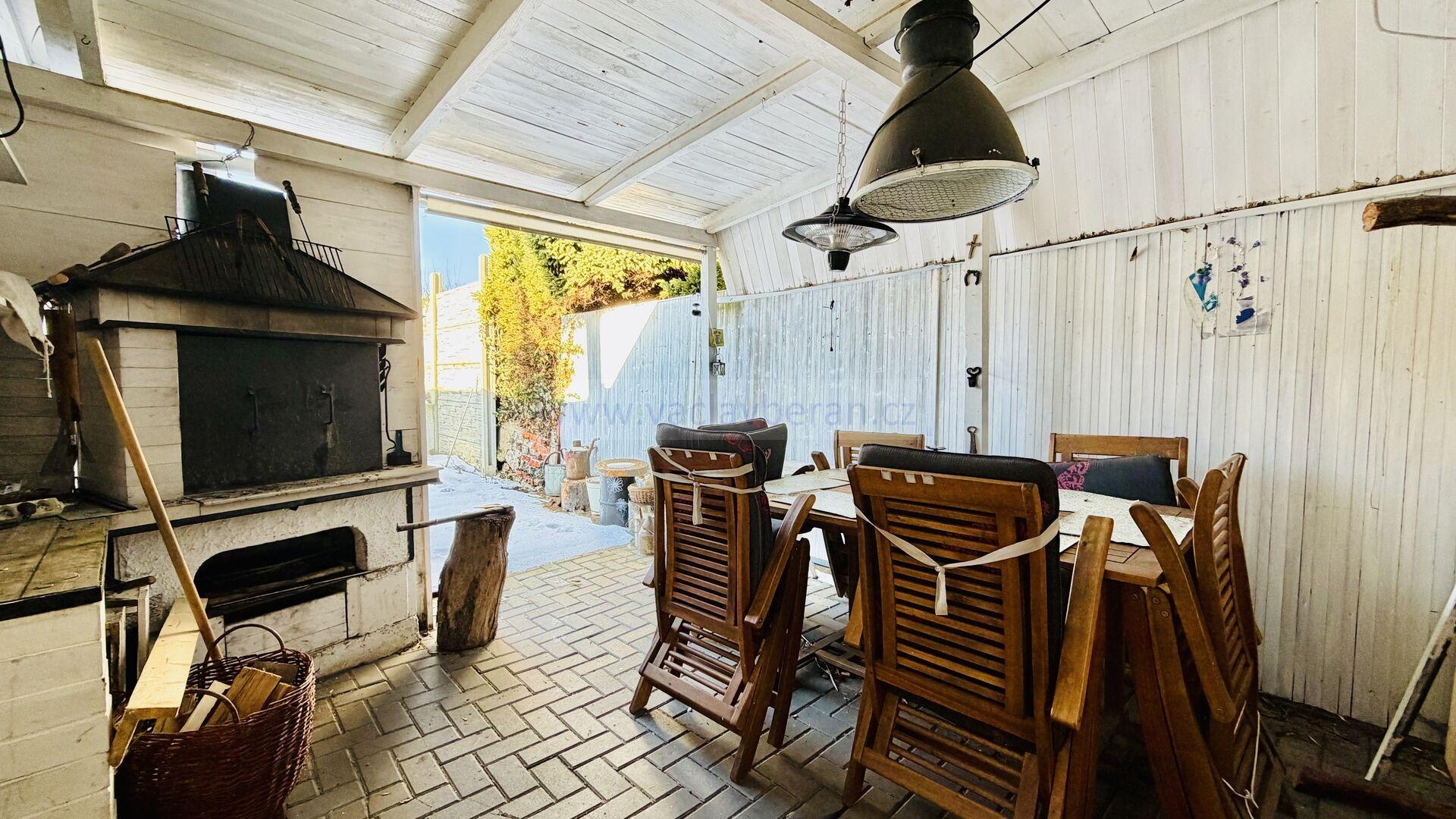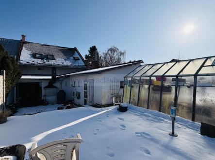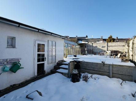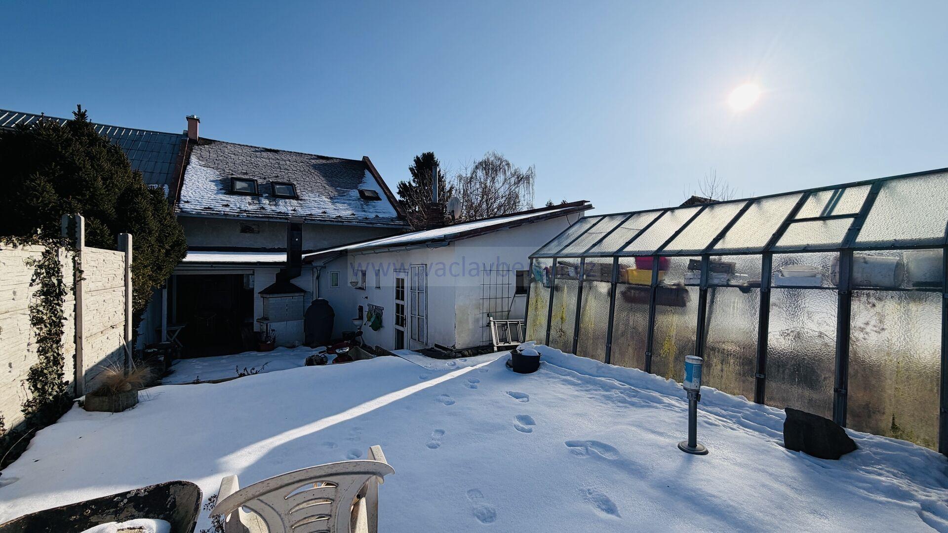 Z obývacího pokoje je výstup na venkovní posezení s krbem, na zahradě zůstává skleník. Od souseda je pronajatá parcela o šířce cca 2m podél domu.